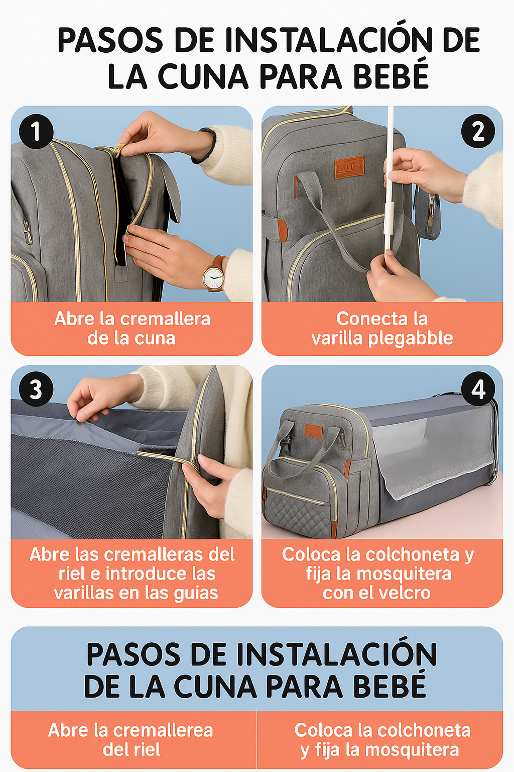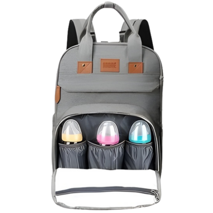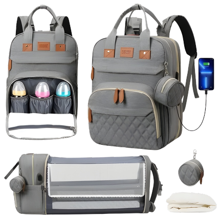 Esta mochila cambiadora está pensada para acompañarte fuera de casa con todo lo que tu bebé necesita. Cuenta con compartimentos organizados para biberones, pañales y accesorios, un cambiador portátil integrado con colchón y forcing (mosquitera), y puerto USB para cargar el móvil en cualquier momento. Todo en un diseño cómodo, resistente y fácil de llevar.